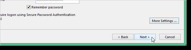 सुनिश्चित करें कि आप उपयोगकर्ता नाम के लिए अपना पूरा ईमेल पता दर्ज करें और पासवर्ड याद रखें, यदि आप चाहते हैं कि आउटलुक ईमेल की जाँच करते समय स्वचालित रूप से आपको लॉग इन करे। अधिक सेटिंग्स पर क्लिक करें।