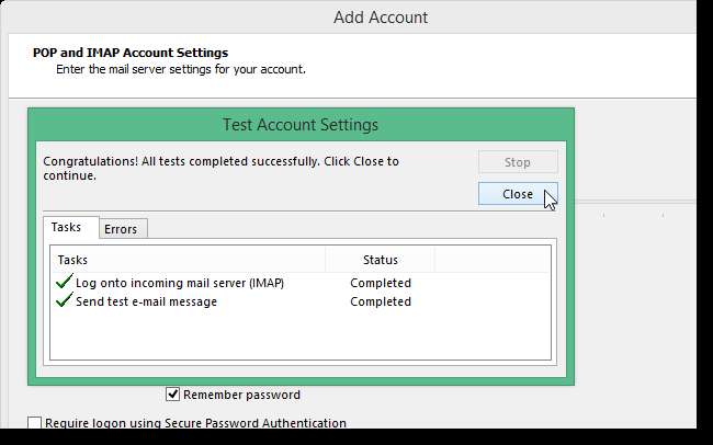 आउटलुक आने वाले मेल सर्वर में लॉग इन करके और परीक्षण ईमेल संदेश भेजकर खातों की सेटिंग्स का परीक्षण करता है। परीक्षण समाप्त होने पर, बंद करें पर क्लिक करें।