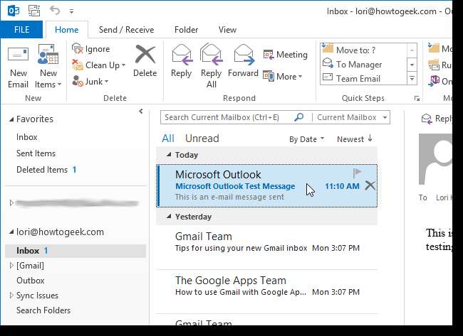 आपका Gmail पता आपके द्वारा Outlook में जोड़े गए किसी भी अन्य ईमेल पते के साथ बाईं ओर खाता सूची में प्रदर्शित होता है। अपने इनबॉक्स में अपने जीमेल खाते में क्या देखने के लिए इनबॉक्स पर क्लिक करें।