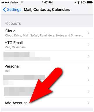 मेल, संपर्क, कैलेंडर स्क्रीन उन सभी खातों को सूचीबद्ध करता है, जिन्हें आपने अपने फ़ोन में पहले से जोड़ा हुआ है। अपना Google खाता जोड़ने के लिए, "खाता जोड़ें" पर टैप करें।