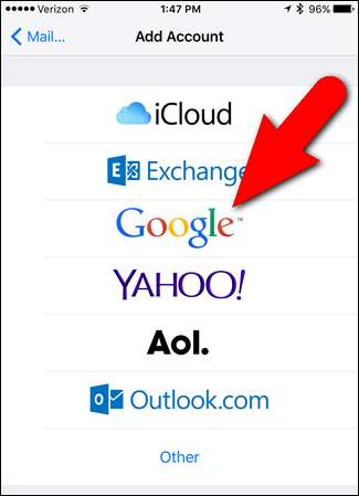 खाता जोड़ें स्क्रीन पर, "Google" पर टैप करें।