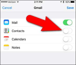 अपने Google खाते से अपने iPhone में संपर्कों को सिंक करने के लिए, "संपर्क" स्लाइडर बटन पर टैप करें।