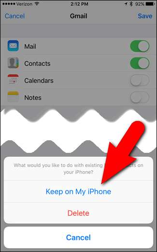 संपर्क स्लाइडर बटन हरे रंग में बदल जाता है जिससे आपके Google खाते के संपर्क आपके फ़ोन में जुड़ जाएंगे। यदि आपने अपने जीमेल खाते को जोड़ने से पहले ही अपने फोन पर कुछ संपर्क बनाए थे, तो एक संदेश आपको यह बताता है कि क्या आप अपने फोन पर मौजूदा स्थानीय संपर्कों को रखना चाहते हैं या उन्हें हटाना चाहते हैं। इन संपर्कों को रखने के लिए, "मेरे iPhone पर रखें" पर टैप करें। आप डुप्लिकेट संपर्कों के साथ समाप्त हो सकते हैं, हालाँकि, आपको अपने iPhone पर संग्रहीत कुछ संपर्कों को हटाने के लिए जाना पड़ सकता है।