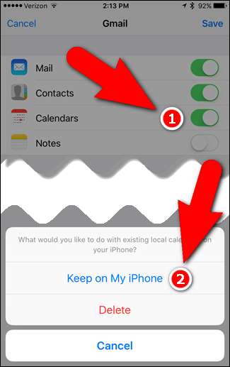अपने Google खाते में कैलेंडर से आइटम सिंक करने के लिए, "कैलेंडर" स्लाइडर बटन पर टैप करें ताकि यह हरा हो जाए। दोबारा, यदि आपने अपना Google खाता जोड़ने से पहले अपने फ़ोन पर कैलेंडर आइटम बनाए हैं, तो एक संदेश प्रदर्शित करता है जिसमें पूछा गया है कि क्या आप उन प्रविष्टियों को रखना चाहते हैं। या तो "मेरे iPhone पर रखें" या "हटाएं" पर टैप करें, जैसे आपने अपने संपर्कों के लिए किया था।