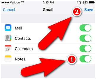 आप भी कर सकते हैं अपने Gmail खाते के साथ नोट्स ऐप में सिंक करें , "नोट्स" स्लाइडर बटन टैप करके। एक बार जब आप अपने Google खाते के लिए सक्षम करना चाहते हैं, तो उन ऐप्स को चुनें, जो "सहेजें" पर टैप करें।