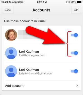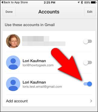आप जिस भी जीमेल अकाउंट में एक्सेस करना चाहते हैं, उसके लिए स्लाइडर बटन पर टैप करें। स्लाइडर बटन आपके द्वारा सक्रिय किए गए किसी भी खाते के लिए नीला हो जाता है।