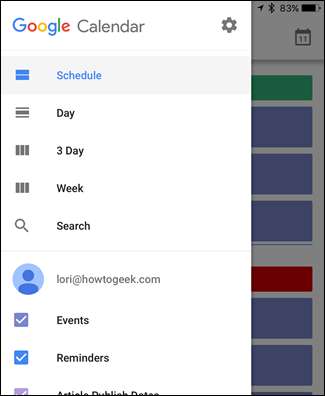 Google कैलेंडर ऐप को Gmail ऐप के समान सेट किया गया है। बस उन Google खातों का चयन करें जिन्हें आप अपने फ़ोन से सिंक करना चाहते हैं या एक नया खाता जोड़ना चाहते हैं। आप स्क्रीन के ऊपरी-बाएँ कोने में मेनू का उपयोग करके अपनी कैलेंडर प्रविष्टियों को देखने के लिए विभिन्न तरीकों का चयन कर सकते हैं।