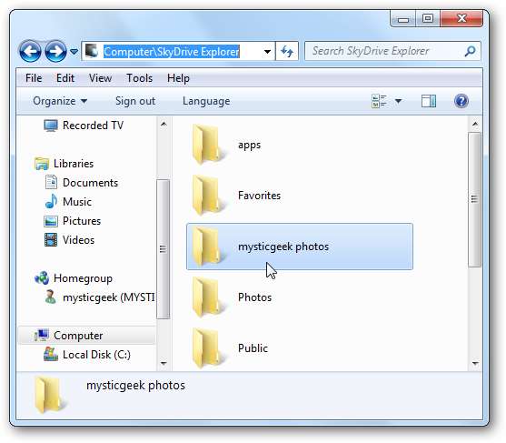 स्काईड्राइव एक्सप्लोरर आपको अपने स्काईड्राइव को आसानी से एक्सेस करने की सुविधा देता है क्योंकि आप अपने पीसी से जुड़े किसी भी अन्य ड्राइव पर पहुंच सकते हैं। दुर्भाग्य से Microsoft अभी भी प्रति अपलोड 50MB की एक व्यक्तिगत फ़ाइल का आकार सीमित करता है। यदि आप बड़ी मीडिया फ़ाइलों को संग्रहीत करने के लिए कुछ खोज रहे हैं, तो SkyDrive सबसे अच्छा विकल्प नहीं है। छोटी फ़ाइलों और दस्तावेज़ों के लिए, स्काईड्राइव एक्सप्लोरर भंडारण, पहुंच और सहयोग के लिए बहुत अच्छा काम करता है। यह XP, Vista, 2003, 2008 और विंडोज 7 पर काम करेगा। यदि आप दस्तावेजों को संग्रहीत और साझा करने के लिए अपने विंडोज लाइव स्काईड्राइव का उपयोग करते हैं, तो यह आसान विंडोज एक्सप्लोरर एक्सटेंशन प्रक्रिया को बहुत आसान बना देगा।