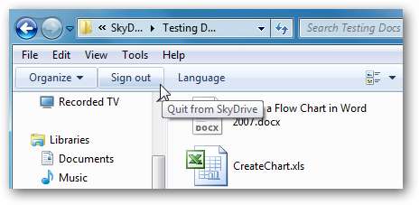 टूलबार से आप अपने स्काईड्राइव से साइन आउट कर सकते हैं।