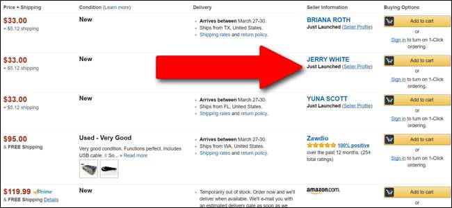 नकली विक्रेताओं और खातों के साथ रहने के बावजूद, अमेज़ॅन अपने बाज़ार को चमकाने में आश्चर्यजनक रूप से मेहनती है: यदि यह रिपोर्टों में स्पाइक देखता है, तो यह विक्रेता के विशेषाधिकार को बिना किसी हिचकिचाहट के हटा देगा। इससे निपटने के लिए, नकली विक्रेता नंबर गेम खेलते हैं और एक बार में कई खाते चलाते हैं। इसका अर्थ है कि अधिकांश स्कैमर्स कुछ दिनों से अधिक, दो सप्ताह के लिए एक सक्रिय खाता नहीं रखते हैं। तो यह इस प्रकार है कि साइट पर लगभग सभी धोखेबाज विक्रेताओं को आइटम लिस्टिंग और उनके विक्रेता प्रोफाइल पर "बस लॉन्च" बैज के साथ लेबल किया जाएगा। फिर से, क्योंकि कोई विक्रेता नया है, इसका मतलब यह नाजायज नहीं है ... लेकिन अन्य चेतावनी संकेतों के साथ, यह स्पष्ट करने का एक अच्छा कारण है।