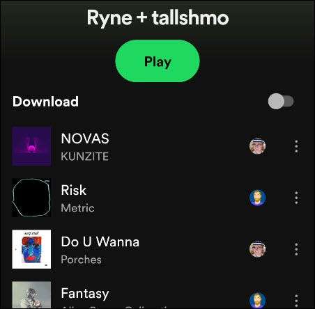 जब दूसरा व्यक्ति जुड़ता है, तो एक प्लेलिस्ट स्वचालित रूप से "व्यक्ति 1 + आपका उपयोगकर्ता नाम" के शीर्षक के साथ बनाई जाएगी। प्लेलिस्ट में गीतों को लेबल किया गया है जिसके अनुसार वे स्क्रीन के दाईं ओर एक छोटे से अवतार आइकन के रूप में आए थे।