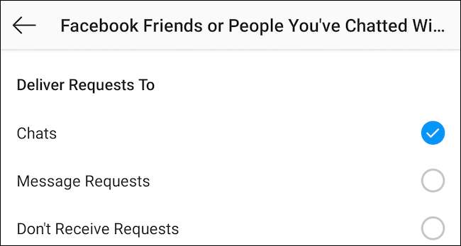डिफ़ॉल्ट "चैट" विकल्प आपके इंस्टाग्राम इनबॉक्स को अव्यवस्थित करने के लिए आपके किसी भी फेसबुक मित्र या परिचितों को देता है। यदि आप अपने फेसबुक दोस्तों को पूरी तरह से ब्लॉक करना चाहते हैं, तो "अनुरोध प्राप्त न करें।" "संदेश अनुरोध" का चयन फेसबुक दोस्तों से अपने इंस्टाग्राम की डीएम अनुरोध सूची में ग्रंथों को भेजता है।