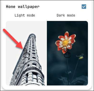 अब हम होम स्क्रीन के लिए वॉलपेपर चुन सकते हैं। अपने डिवाइस से एक फोटो चुनने के लिए प्रत्येक "लाइट मोड" और "डार्क मोड" छवि को टैप करें। आपको अपने डिवाइस के स्टोरेज तक पहुंचने के लिए ऐप अनुमति देने की आवश्यकता होगी।