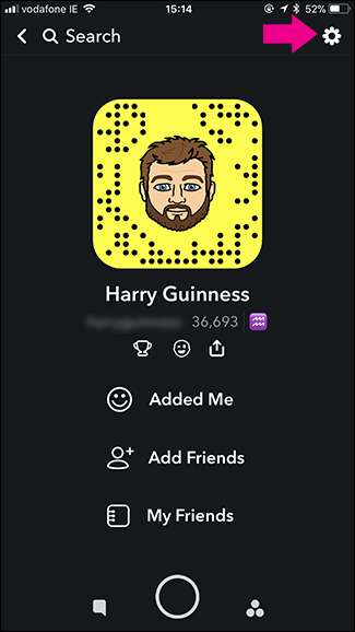 स्नैपचैट खोलें और मेनू को ऊपर लाने के लिए स्क्रीन के ऊपर बाईं ओर अपने प्रोफ़ाइल आइकन पर टैप करें। इसके बाद ऊपर दाईं ओर सेटिंग आइकन पर टैप करें।
