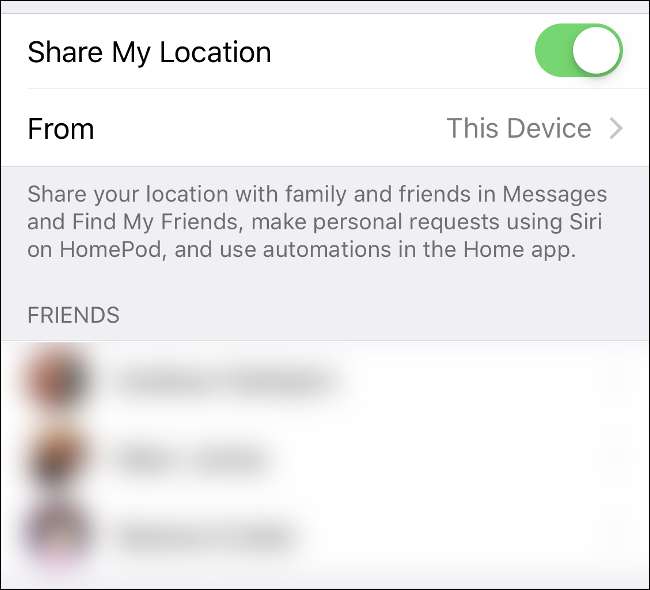 यह भूलना आसान हो सकता है कि आपने किसके साथ अपना स्थान साझा किया है, इसलिए आप सेटिंग> गोपनीयता> स्थान सेवाओं के तहत इसकी समीक्षा कर सकते हैं। संपर्कों की एक सूची लाने के लिए "मेरा स्थान साझा करें" पर टैप करें जो लगभग वास्तविक समय में आपकी जीपीएस स्थिति को ट्रैक कर सकते हैं। आप "शेयर माय लोकेशन" को टॉगल करके या "से" पर टैप करके एक और ऐप्पल डिवाइस चुन सकते हैं जिसमें से प्रसारण के लिए पूरी तरह से सेटिंग को अक्षम कर सकते हैं।