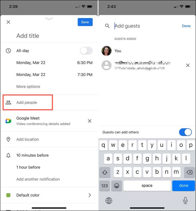 शीर्ष पर दिनांक और समय दर्ज करें, फिर नल के नीचे "लोग जोड़ें"। खोजें या व्यक्ति आप को जोड़ने के लिए और नल चाहते हैं का चयन "हो गया।"