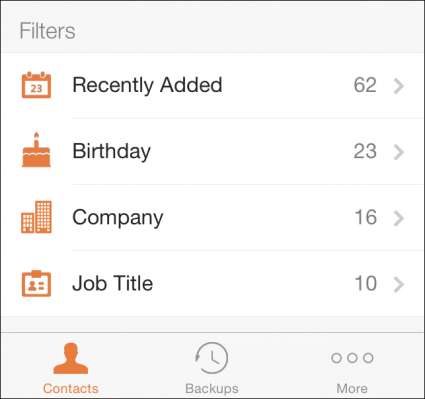 इतना ही नहीं, बल्कि एप्लिकेशन भी निर्धारित श्रेणियों के माध्यम से आप झारना करने में मदद करने के लिए अपनी श्रेणियों बनाने के लिए दूर चला जाता है। उदाहरणों में "हाल ही में जोड़ा गया" खंड (तिथि द्वारा सूचीबद्ध), "आगामी जन्मदिन", और यहां तक कि उन व्यक्तिगत कंपनियों द्वारा सॉर्ट किए गए संपर्क भी शामिल हैं जिनके लिए वे काम करते हैं।