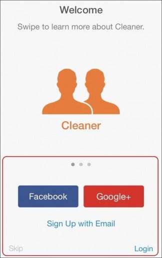 क्लीनर का उपयोग करने के लिए, पहले आपको अपने लिंक्ड फ़ेसबुक या Google खाते के साथ साइन इन करना होगा, या सीधे ऐप के साथ अपना खुद का एक बनाना होगा।