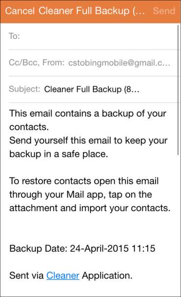 आपके पास बैकअप फ़ाइल को अपने क्लीनर खाते में सहेजने का विकल्प होगा, या iOS मेल ऐप के माध्यम से इसे स्वयं को ईमेल करें।