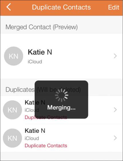 मेरे मामले में क्लीनर केवल एक जोड़ी को गिराने में सक्षम था, जिसे बिना किसी अतिरिक्त कीमत पर विलय या हटाया जा सकता है। आप यह भी देख सकते हैं कि एक बार हाइलाइट किए गए पूर्वावलोकन विकल्प को ऊपर से टैप करके अंतिम संपर्क कैसा दिखेगा।