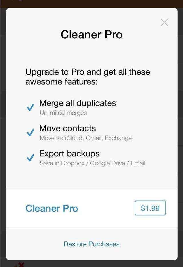 यहां एक चेतावनी यह है कि यदि एप्लिकेशन को एक बार में 10 से अधिक डुप्लिकेट पते मिलते हैं, तो आपको एक संकेत दिखाई देगा, जिसमें पूछा जाएगा कि क्या आप सभी संपर्कों को एक साथ मर्ज करना चाहते हैं, बजाय एक-एक हाथ से। जब तक आप प्रो संस्करण के लिए $ 1.99 से अधिक का कांटा नहीं लगाते हैं, तब तक यह काम नहीं करता है, लेकिन यह सुविधा क्लीनर ऑफ़र के लिए भुगतान करने के लिए एक छोटी सी कीमत है, क्या आपको नहीं लगता है?