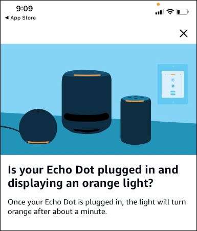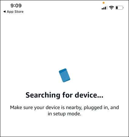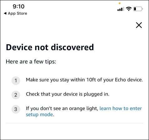 यदि आपके एलेक्सा-संचालित डिवाइस की खोज नहीं की गई है, तो सुनिश्चित करें कि आप सीमा (10 फीट के भीतर) के भीतर हैं, जांचें कि यह सही ढंग से प्लग इन है, और इसे आपके ऊपर प्रकाश होने तक कार्रवाई बटन दबाकर सेटअप मोड में डाल दें डिवाइस "जारी रखें" से पहले नारंगी बदल जाता है।