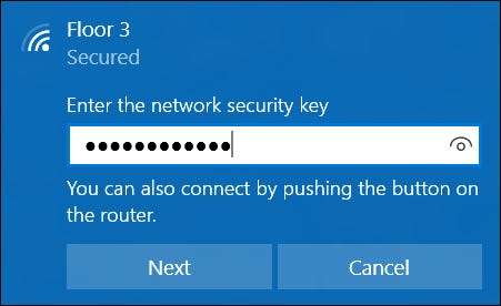 इसके बाद, विंडोज आपके मॉडेम / राउटर के लिए आपको सुरक्षा कुंजी, या पासवर्ड के लिए संकेत देता है। आगे बढ़ो और उस में टाइप करें, और फिर "अगला" बटन दबाएं।