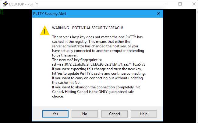 यदि आप सर्वर से एक बार कनेक्ट होने के बाद भविष्य में यह चेतावनी देखते हैं, तो यह इंगित करता है कि सर्वर की एन्क्रिप्शन कुंजी फिंगरप्रिंट अलग है। या तो सर्वर प्रशासक ने इसे बदल दिया है या कोई व्यक्ति आपके ट्रैफ़िक को रोक रहा है और आपको दुर्भावनापूर्ण, इम्पॉर्टेंट एसएसआर सर्वर से जोड़ने की कोशिश कर रहा है। सावधान रहे!