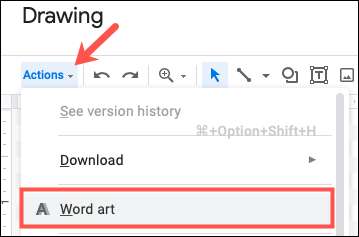 जब ड्राइंग विंडो खुलती है, तो ऊपरी-बाएं कोने में "क्रियाएं" ड्रॉप-डाउन सूची पर क्लिक करें और "शब्द कला" चुनें।