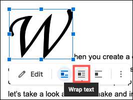 पत्र का चयन करें, और एक छोटा टूलबार मेनू इसके नीचे दिखाई देगा। "रैप टेक्स्ट" के लिए केंद्र संरेखण विकल्प पर क्लिक करें।