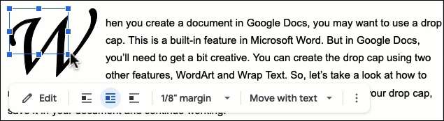 आप अपने Google डॉक्स दस्तावेज़ की शुरुआत में ड्रॉप कैप देखेंगे। यदि आप पहले से ऐसा नहीं करते हैं तो आपको पहले अक्षर को हटाने की आवश्यकता हो सकती है। डिफ़ॉल्ट रूप से, ड्रॉप कैप टेक्स्ट के अनुरूप है, जैसा कि आप नीचे स्क्रीनशॉट में देख सकते हैं। आप एक अधिक प्राकृतिक रूप के लिए लपेटें टेक्स्ट संरेखण का उपयोग करना चाहेंगे।