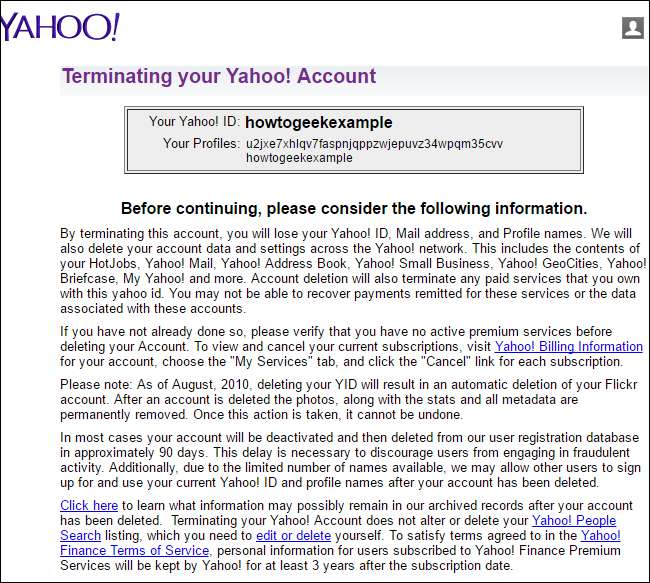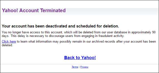 आपको सूचित किया जाएगा कि आपका याहू खाता समाप्त हो गया है और लगभग 90 दिनों में याहू के उपयोगकर्ता डेटाबेस से डेटा हटा दिया जाएगा।