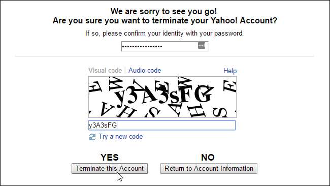एक बार जब आप सुनिश्चित कर लें कि आप अपना खाता हटाना चाहते हैं, तो आपको अपना खाता पासवर्ड दर्ज करने की आवश्यकता होगी, पृष्ठ पर प्रदर्शित कैप्चा कोड प्रदान करें, और "यह खाता समाप्त करें" बटन पर क्लिक करें।