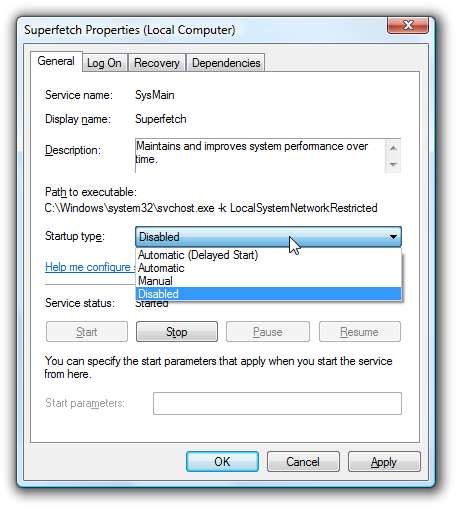 गुणों को खोलने के लिए सूची में Superfetch पर डबल-क्लिक करें, और फिर ड्रॉप-डाउन को "अक्षम" में बदल दें। आप इसे तुरंत बंद करने के लिए स्टॉप पर भी क्लिक कर सकते हैं।