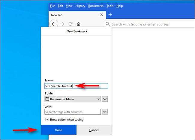 सबसे पहले, एक फ़ायरफ़ॉक्स विंडो खोलें और CTRL + D (विंडोज और लिनक्स पर) या कमांड + डी (मैक पर) दबाकर किसी भी साइट को बुकमार्क करें। बुकमार्क को कुछ विशिष्ट नाम दें, जैसे "साइट खोज शॉर्टकट", ताकि आप इसे आसानी से अपने बुकमार्क लाइब्रेरी में ढूंढ सकें। फिर "संपन्न" पर क्लिक करें।