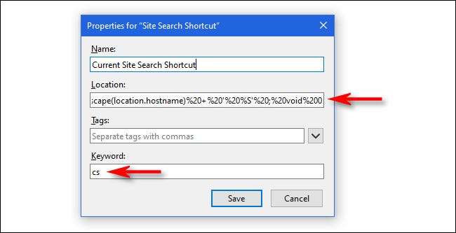 इसके बाद, "कीवर्ड" फ़ील्ड पर क्लिक करें और "सीएस" टाइप करें ("वर्तमान साइट" के लिए) या किसी अन्य स्मॉलोनिक शॉर्टकट कीवर्ड जिसे आप साइट खोज को ट्रिगर करने के लिए टाइप करना चाहते हैं।