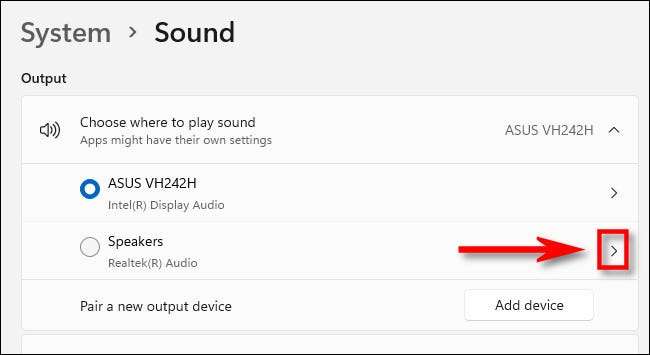 जब सेटिंग्स "ध्वनि" पृष्ठ पर खुलती हैं, तो शीर्ष के पास "आउटपुट" अनुभाग ढूंढें और ऑडियो आउटपुट डिवाइस के बगल में बेडवे कैरेट (तीर) पर क्लिक करें जिसे आप अक्षम करना चाहते हैं।