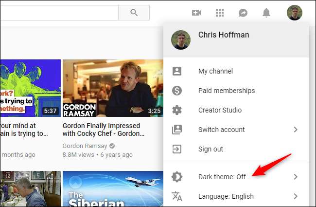 YouTube की डेस्कटॉप वेबसाइट पर, पृष्ठ के ऊपरी दाएं कोने में अपने प्रोफ़ाइल आइकन पर क्लिक करें। मेनू में "डार्क थीम" विकल्प पर क्लिक करें।