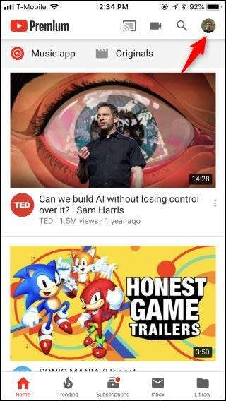 IPhone और iPad के लिए YouTube ऐप का अपना डार्क मोड विकल्प भी है। इसे सक्षम करने के लिए, एप्लिकेशन लॉन्च करें और स्क्रीन के ऊपरी दाएं कोने पर अपना प्रोफ़ाइल आइकन टैप करें।