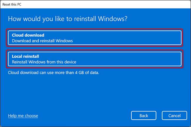 ए "आप विंडोज़ को पुनर्स्थापित करना चाहेंगे" स्क्रीन दिखाई देगी। यदि आप चाहें विंडोज 11 को पुनर्स्थापित करें क्लाउड से, "क्लाउड डाउनलोड" विकल्प का चयन करें। स्थानीय रूप से विंडोज 11 को पुनर्स्थापित करने के लिए, "स्थानीय पुनर्स्थापित" विकल्प का चयन करें। यदि आप सुनिश्चित नहीं हैं, तो हमारे पास एक गाइड है बादल और स्थानीय पुनर्स्थापित के बीच चयन करना ।