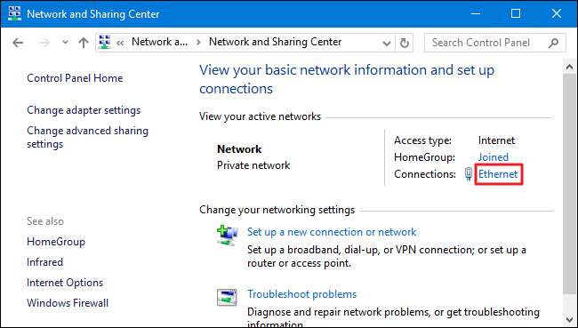 "नेटवर्क और साझाकरण केंद्र" विंडो के ऊपरी दाएं कोने में, अपने नेटवर्क कनेक्शन के नाम पर क्लिक करें।