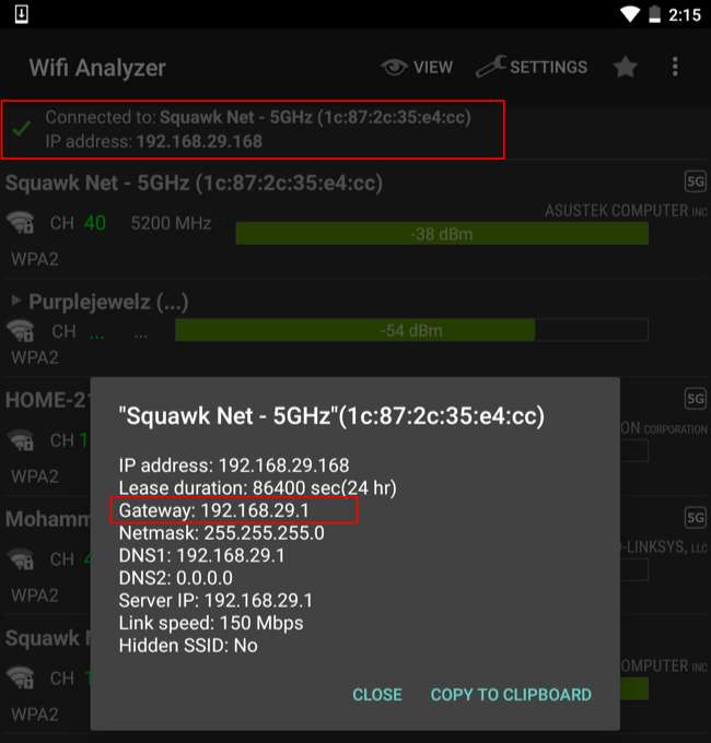 यदि आप वाई-फाई एनालाइज़र का उपयोग करते हैं, तो "देखें" मेनू पर टैप करें, और फिर "एपी सूची" चुनें। इस स्क्रीन के शीर्ष पर, आपको "कनेक्टेड टू: [Network Name]" हेडर दिखाई देगा। वह टैप करें और आपके नेटवर्क के बारे में अधिक जानकारी के साथ एक विंडो दिखाई देगी। आपको राउटर का पता "गेटवे" के रूप में सूचीबद्ध मिलेगा।