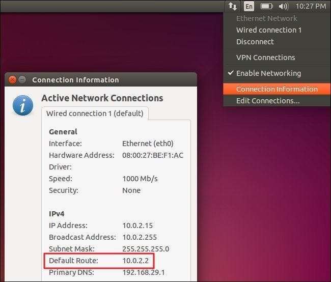 अधिकांश लिनक्स डेस्कटॉप में उनके अधिसूचना क्षेत्र में एक नेटवर्क आइकन होता है। आमतौर पर, आप इस नेटवर्क आइकन पर क्लिक कर सकते हैं और फिर "कनेक्शन सूचना" का चयन कर सकते हैं — और ऐसा ही कुछ। "डिफ़ॉल्ट मार्ग" या "गेटवे" के आगे प्रदर्शित आईपी पते की तलाश करें।