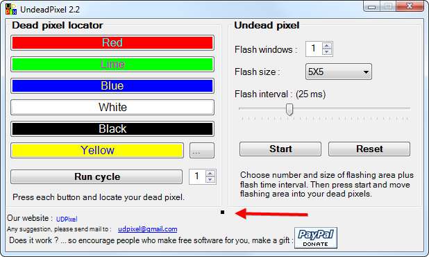 प्रयत्न UndeadPixel (UDPixel) यदि आप ऐसा करने वाले प्रोग्राम की तलाश में हैं। इसमें बिल्ट-इन स्टिक पिक्सेल लोकेटर है जो आपकी स्क्रीन पर रंगों को चक्रित करता है। इसका मुख्य उपकरण आपको थोड़ी चमकती बिंदी देगा जिसे आप अपनी स्क्रीन पर कहीं भी खींच और छोड़ सकते हैं - इसे मृत पिक्सेल पर खींचें और इसे कम से कम कई घंटों तक चलने दें।