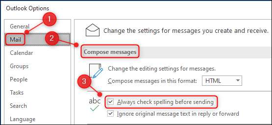 मेल में & gt; संदेश अनुभाग लिखें, "हमेशा" भेजने से पहले वर्तनी जांचें "चेकबॉक्स पर टॉगल करें।