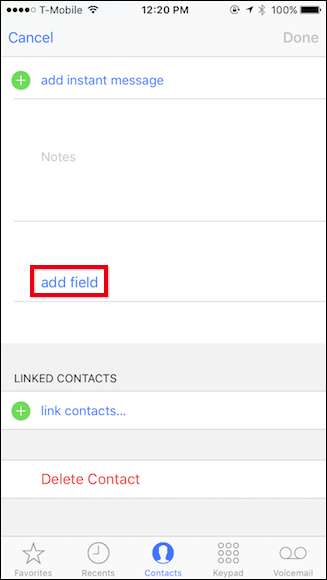 ऐसा करने के लिए, संपर्क चुनें, "संपादित करें" बटन पर टैप करें, और फिर नीचे स्क्रॉल करें और "फ़ील्ड जोड़ें" विकल्प पर टैप करें।