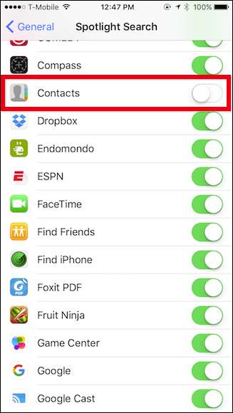ध्यान रखें, चाहे आप अपने संपर्कों को छिपाने की कितनी भी अच्छी कोशिश करें, फिर भी वे स्पॉटलाइट खोजों में दिखाई देंगे। अपने संपर्कों को खोजों से हटाने के लिए, आपको अपनी सेटिंग ऐप पर टैप करना होगा और सामान्य> स्पॉटलाइट खोज पर जाना होगा।