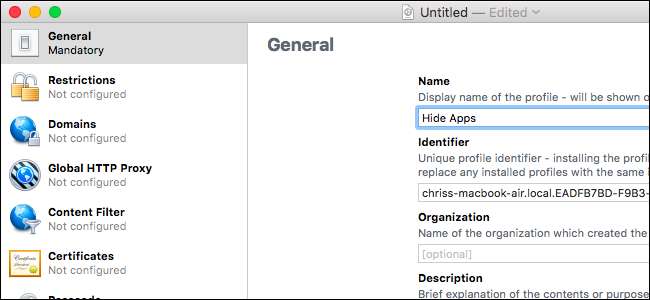 Apple विन्यासक और फ़ाइल> नई प्रोफ़ाइल के प्रमुख को लॉन्च करें। सामान्य स्क्रीन पर, आपको यह याद रखने में मदद करने के लिए एक नाम दर्ज करें कि प्रोफ़ाइल क्या है। आप उदाहरण के लिए प्रोफाइल "Hide Apps," नाम दे सकते हैं। यदि आप चाहें, तो आप यहां अन्य जानकारी को अनुकूलित कर सकते हैं, लेकिन यह आवश्यक नहीं है।