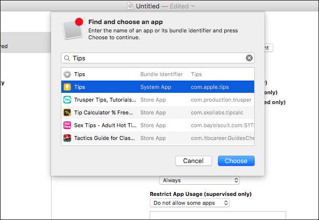 उदाहरण के लिए, मान लें कि आप शामिल "टिप्स" ऐप को ब्लॉक करना चाहते हैं। बस यहां "टिप्स" के लिए खोज करें और आपको "टिप्स" नामक एक ऐप दिखाई देगा जो "सिस्टम ऐप" है। इसका मतलब है कि यह iOS ऑपरेटिंग सिस्टम का एक हिस्सा है। आप यहां "स्टोर ऐप्स" भी देखेंगे - यह आपको उपयोगकर्ताओं को ऐप्पल के ऐप स्टोर से विशिष्ट एप्लिकेशन इंस्टॉल करने और चलाने से रोकने की अनुमति देता है।