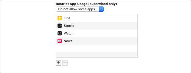 "प्रतिबंधित एप्लिकेशन उपयोग (केवल पर्यवेक्षित)" के तहत, ड्रॉप-डाउन बॉक्स पर क्लिक करें और "कुछ ऐप्स की अनुमति न दें" का चयन करें। "+" बटन पर क्लिक करें और आपको एक बॉक्स दिखाई देगा जो आपको उन ऐप्स को खोजने और जोड़ने की अनुमति देता है जिन्हें आप ब्लॉक करना चाहते हैं। उस ऐप का नाम लिखें जिसे आप सूची से ऐप को छिपाना और चुनना चाहते हैं।